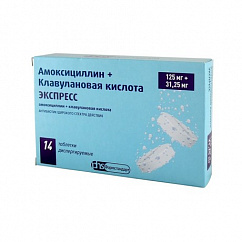 Таблетки диспергируемые от белого до светло-желтого цвета, овальные, двояковыпуклые, с риской с одной стороны, допускается мраморность и наличие единичных коричневых вкраплений.1 таб.амоксициллина тригидрат143.47 мг, что соответствует содержанию амоксициллина125 мгклавуланат калия74.46 мг, что соответствует содержанию клавулановой кислоты31.25 мгВспомогательные вещества: целлюлоза микрокристаллическая 302 - 21.77 мг, кросповидон - 50.3 мг, ванилин - 0.25 мг, сахарин - 2.25 мг, магния стеарат - 1.25 мг, ароматизатор абрикосовый - 2.25 мг.7 шт. - упаковки ячейковые контурные (2) - пачки картонные.7 шт. - упаковки ячейковые контурные (1) - упаковки (2) - пачки картонные.8 шт. - упаковки ячейковые контурные (1) - упаковки (2) - пачки картонные.14 шт. - флаконы (1) - пачки картонные.Таблетки диспергируемые от белого до светло-желтого цвета, двояковыпуклые, допускается мраморность и наличие единичных коричневых вкраплений.1 таб.амоксициллина тригидрат286.95 мг, что соответствует содержанию амоксициллина250 мгклавуланат калия148.91 мг, что соответствует содержанию клавулановой кислоты (в форме калиевой соли)62.5 мгВспомогательные вещества: целлюлоза микрокристаллическая 302 - 43.54 мг, кросповидон - 100.6 мг, ванилин - 0.5 мг, сахарин - 4.5 мг, магния стеарат - 2.5 мг, ароматизатор абрикосовый - 4.5 мг.7 шт. - упаковки ячейковые контурные (2) - пачки картонные.7 шт. - упаковки ячейковые контурные (1) - упаковки (2) - пачки картонные.8 шт. - упаковки ячейковые контурные (1) - упаковки (2) - пачки картонные.14 шт. - флаконы (1) - пачки картонные.Таблетки диспергируемые от белого до светло-желтого цвета, двояковыпуклые, допускается мраморность и наличие единичных коричневых вкраплений.1 таб.амоксициллина тригидрат573.89 мг, что соответствует содержанию амоксициллина500 мгклавуланат калия297.82 мг, что соответствует содержанию клавулановой кислоты (в форме калиевой соли)125 мгВспомогательные вещества: целлюлоза микрокристаллическая 302 - 87.09 мг, кросповидон - 201.2 мг, ванилин - 1 мг, сахарин - 9 мг, магния стеарат - 5 мг, ароматизатор абрикосовый - 9 мг.7 шт. - упаковки ячейковые контурные (2) - пачки картонные.7 шт. - упаковки ячейковые контурные (1) - упаковки (2) - пачки картонные.8 шт. - упаковки ячейковые контурные (1) - упаковки (2) - пачки картонные.10 шт. - флаконы (1) - пачки картонные.Таблетки диспергируемые от белого до светло-желтого цвета, овальные, двояковыпуклые, допускается мраморность и наличие единичных коричневых вкраплений.1 таб.амоксициллина тригидрат1004.43 мг, что соответствует содержанию амоксициллина875 мгклавуланат калия297.82 мг, что соответствует содержанию клавулановой кислоты (в форме калиевой соли)125 мгВспомогательные вещества: целлюлоза микрокристаллическая 302 - 1.7 мг, кросповидон - 421.51 мг, ванилин - 1 мг, сахарин - 16.11 мг, магния стеарат - 7.43 мг, ароматизатор мандариновый - 9 мг, ароматизатор лимонный - 11 мг.7 шт. - упаковки ячейковые контурные (2) - пачки картонные.7 шт. - упаковки ячейковые контурные (1) - упаковки (2) - пачки картонные.8 шт. - упаковки ячейковые контурные (1) - упаковки (2) - пачки картонные.5 шт. - флаконы (1) - пачки картонные.