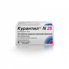 Таблетки, покрытые пленочной оболочкой желтого цвета, круглые, плоскоцилиндрической формы.1 таб.дипиридамол25 мгВспомогательные вещества: крахмал кукурузный - 67.75 мг, лактозы моногидрат - 28.5 мг, желатин - 2.5 мг, карбоксиметилкрахмал натрия (тип А) - 3.75 мг, кремния диоксид коллоидный безводный - 1.25 мг, магния стеарат - 1.25 мг.Состав оболочки: гипромеллоза - 0.9 мг, тальк - 0.4 мг, макрогол 6000 - 1.2 мг, титана диоксид (Е171) - 0.1 мг, краситель хинолиновый желтый (Е104) - 0.008 мг, симетикона эмульсия - 0.002 мг.120 шт. - флаконы бесцветного стекла (1) - пачки картонные.
