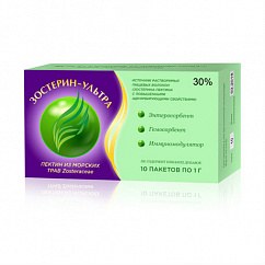 Натуральный многофункциональный пектин нового поколения Зостерин-ультра действует на организм одновременно как энтеросорбент, гемосорбент и иммуномодулятор. Производится из морской травы Zostera marina по специальной технологии, не включающей химических компонентов. Действие Зостерин-Ультра: предотвращает обострение язвенной болезни и способствует заживлению язвы желудка и двенадцатиперстной кишки, улучшает пищеварение, способствует нормализации массы тела;способствует восстановлению функции поджелудочной железы при остром и хроническом панкреатите;снижает уровень холестерина в крови;улучшает обмен веществ в организме и используется в качестве дополнительного средства при лечении сахарного диабета;замедляет рост раковых клеток, при химиотерапии и лучевой терапии используется в качестве мощного детоксиканта;при гепатитах применяется для ускорения восстановления печени;эффективен при лечении аллергии различного происхождения;эффективен при профилактике простудных заболеваний и гриппа;устраняет побочные явления, вызванные другими лекарственными препаратами (антибиотиками);эффективен при профилактике и лечении профессиональных заболеваний - отравлений тяжелыми металлами, их соединениями и другими токсическими веществами.